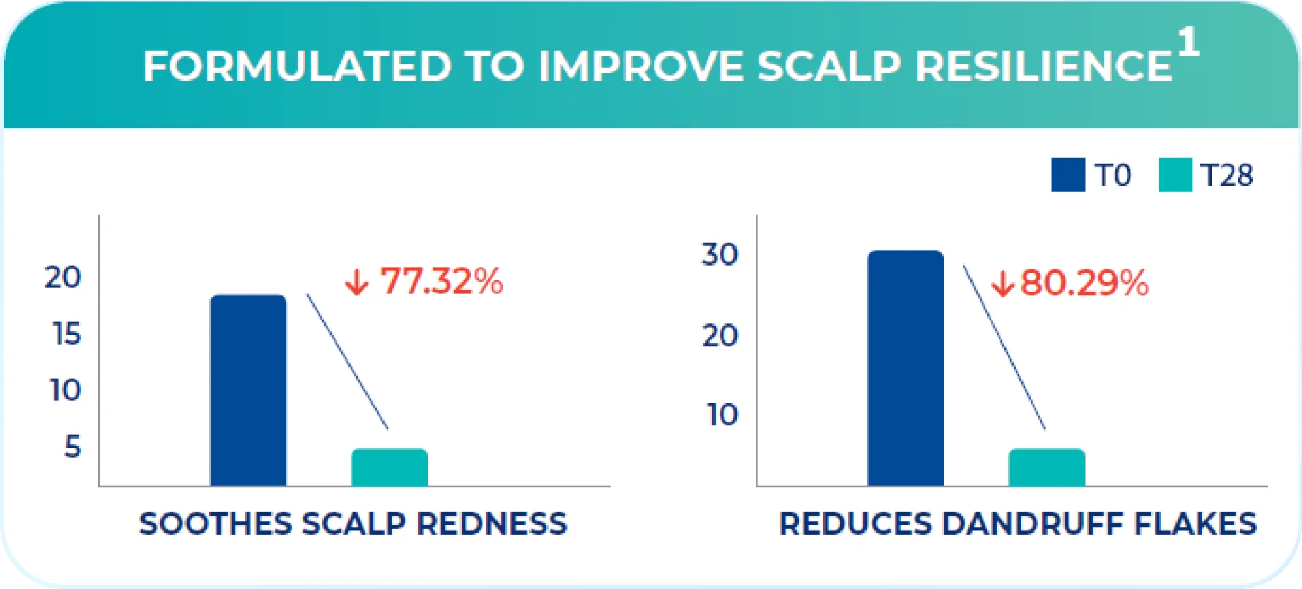 - ผลวิจัยในกลุ่มอาสาสมัคร เพศชายและหญิง อายุ 18-71 ปี จำนวน 40 คน ในเดือนธันวาคม 2566 80% ของผู้ใช้ พบว่า รังแคที่มองเห็นได้ดูลดลงใน 28 วัน โดย Dermatest ประเทศเยอรมัน (เมื่อใช้เป็นประจำอย่างต่อเนื่อง ผลลัพธ์ที่ได้ขึ้นอยู่กับสภาพผิวของแต่ละบุคคล)