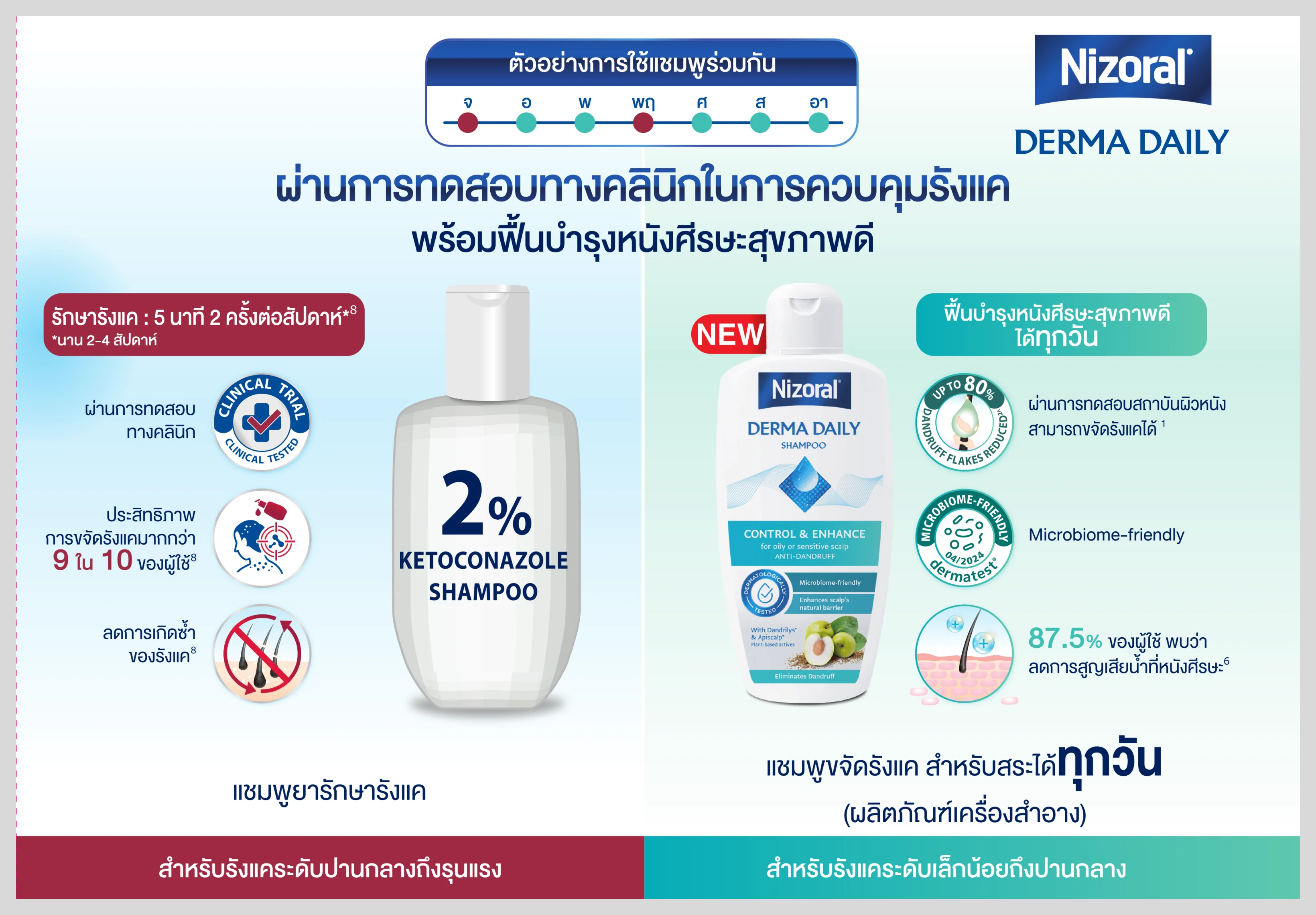 - ผลวิจัยในกลุ่มอาสาสมัคร จานวน 20 คน ในเดือนกุมภาพันธ์ 2567 พบว่าอัตราส่วนของ Cutibacterium/S. epidermidis เพิ่มขึ้น 19.5% ใน 28 วัน โดย Analysis Report – Microbiome Friendly Nizoral Derma Daily Anti-Dandruff Shampoo ประเทศเยอรมัน (เมื่อใช้เป็นประจาอย่างต่อเนื่อง ผลลัพธ์ที่ได้ขึ้นอยู่กับสภาพผิวของแต่ละบุคคล)